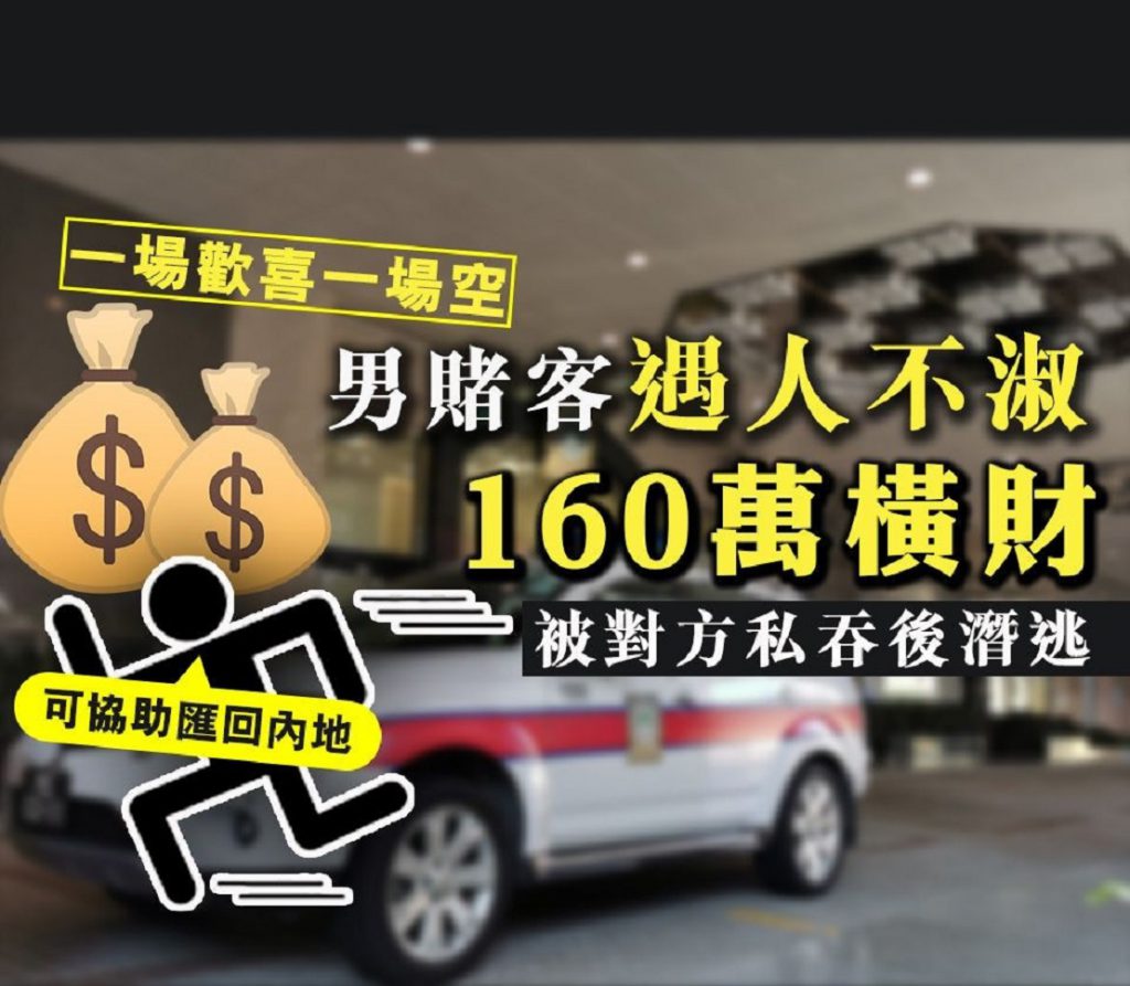 一名内地男赌客早前来澳赌博时赢了160多万港元横财,可惜因遇人不淑,误信沓码仔可协助汇回内地,结果一场欢喜一场空!该笔巨款被对方私吞后潜逃。涉案沓码仔日前机场再入境时随即被司警拘捕,司警现正追查有关赃款下落。