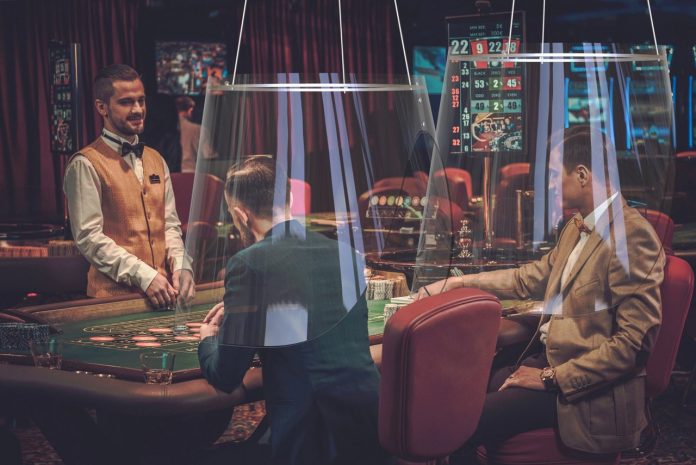 美高梅集团旗下赌场内,可见有机玻璃屏障,为的是确保赌客与员工保持两米社交距离。