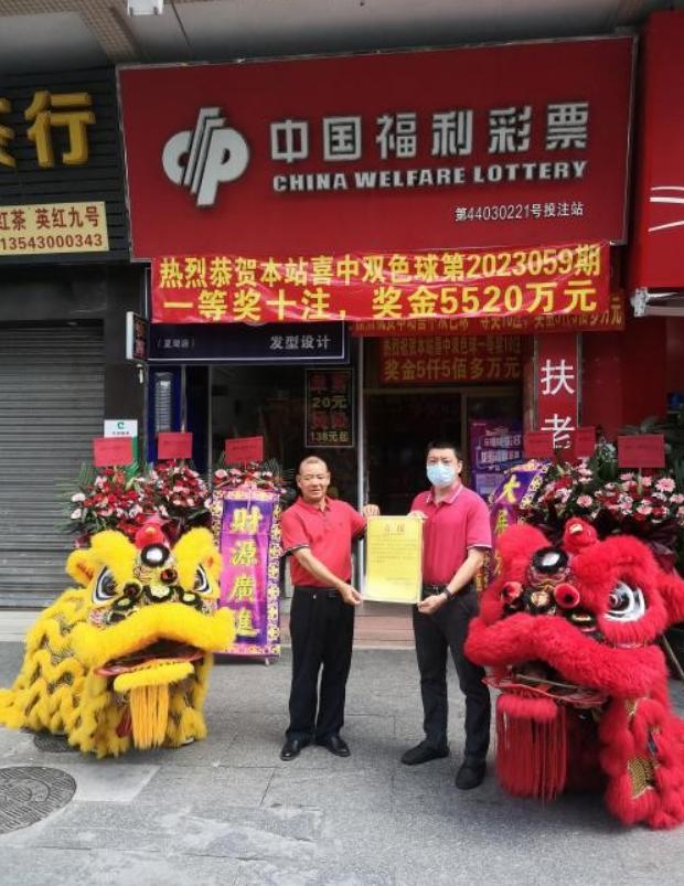 5月25日晚,双色球第23059期开奖,当期双色球红球号码为02、06、13、22、27、32,蓝球号码为06。结果一等奖全国井喷30注,单注奖金552万多元,这30注一等奖中有10注来自于广东珠海,经系统检索,珠海夏湾一福彩销售网点喜中双色球第2023059期双色球10注,总奖金高达5520万元。 5月31日上午,中奖彩民陈先生(化名)平静地来到市福彩中心兑取了5520万元巨奖。