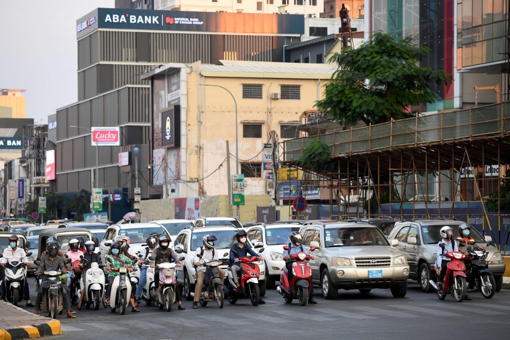 Motorists wait at a traffic light on a street in Phnom Penh on January 11, 2021. (Photo by TANG CHHIN Sothy / AFP)
