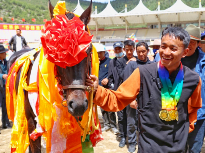 此次马术比赛设有甲、乙、丙组5000米、3000米、1000米速度赛马,甲、乙、丙组3000米、1000米走马赛及跑马射箭、跑马拾哈达17个项目,来自香格里拉市建塘镇诺西村代表队的嘎提七林和来自香格里拉市虎跳峡代表队知诗定主一人分别包揽4枚金牌,成为了此次比赛的最大赢家。