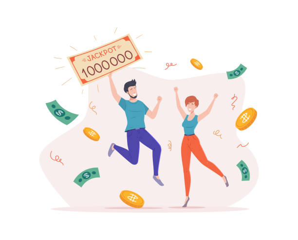 Rejoice couple holding bank check for million celebrating financial success. Happy man and woman winner of grant or lottery gain surrounded by falling cash money dollar and coin confetti vector flat
