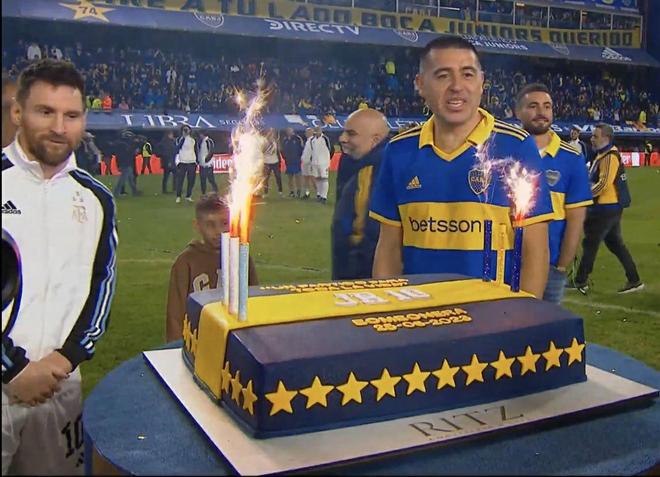 比赛正式开始前,参赛球员在场上热身。当现场DJ念到梅西名字时,全场球迷一起高喊梅西名字,并作出膜拜的动作。在阿根廷球迷的心中,梅西已等同于神。值得一提的是,梅西和里克尔梅的生日都是6月24日。主办方赛前特意为他俩一同准备了大蛋糕,球迷同唱生日歌。