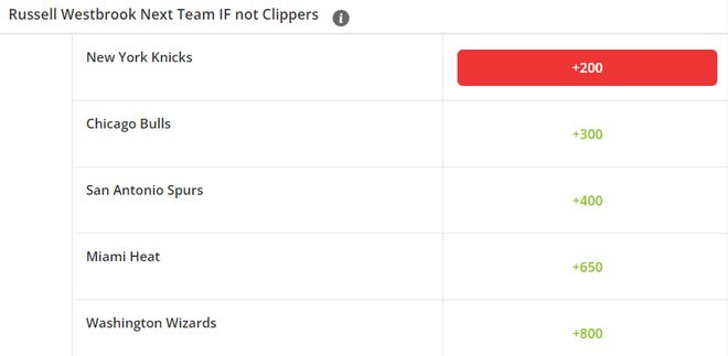 如果威少不留在快船,他最有可能去哪儿呢?威少的新下家赔率出炉,尼克斯高居首位,公牛第二马刺第三。值得一提的是两支CBA球队也上榜了。