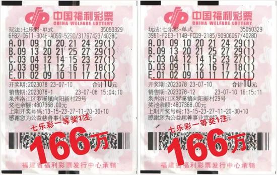 7月10日晚开奖的福彩30选7(七乐彩)第2023078期,全国中出4注单注奖金为166万多元的一等奖,我省购彩者喜获其中2注!这2注一等奖皆花落泉州市洛江区罗溪镇向阳新村29号的福彩35050329投注站,2张中奖彩票均是一张5注号码的单式票,这2张彩票共获奖金333万多元。