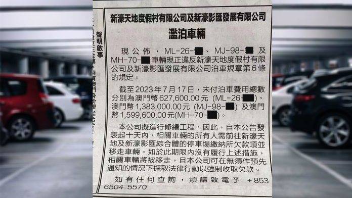 新濠表示,自公告发出起10天内,要求相关汽车的所有人前往新濠天地及新濠影滙的停车场缴纳欠款并移走车辆,否则会主动将车辆移走,且在无预先通知的情况下採取法律行动以强制收取欠款。
