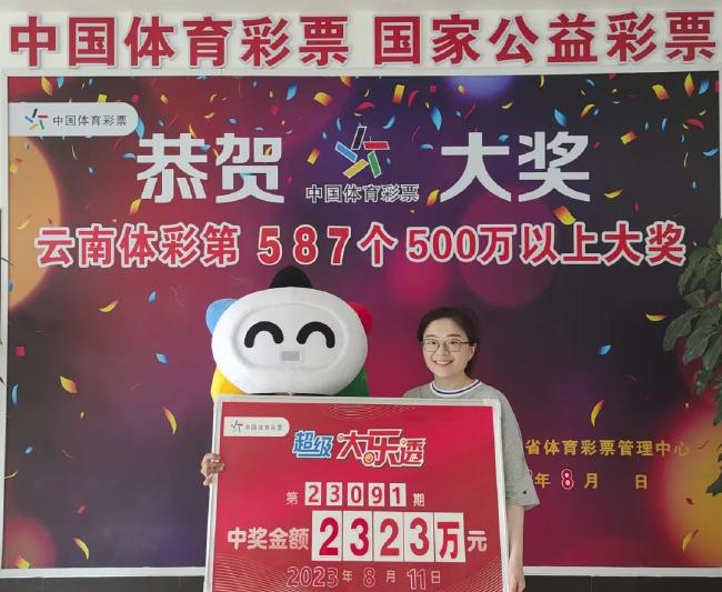 2023年8月9日,超级大乐透第23091期开奖,云南购彩者王女士(化姓)凭借一张6元单式倍投票中出2注追加一等奖,收获奖金2323万。截至8月14日,云南已中出31个单票500万元以上大奖!