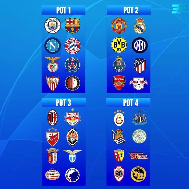 第1档:曼城、塞维利亚、巴萨、那不勒斯、拜仁、巴黎、本菲卡、费耶诺德
