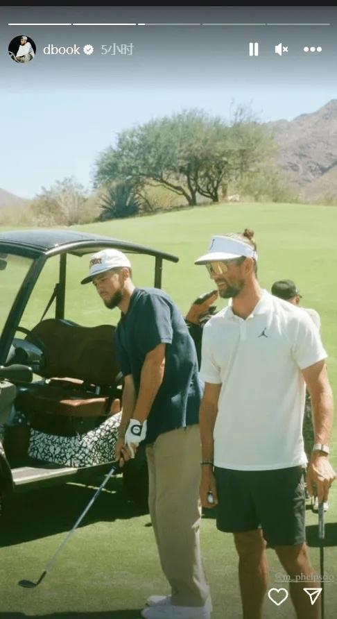 布克晒出了打高尔夫的照片,美国游泳名将菲尔普斯也在其中。