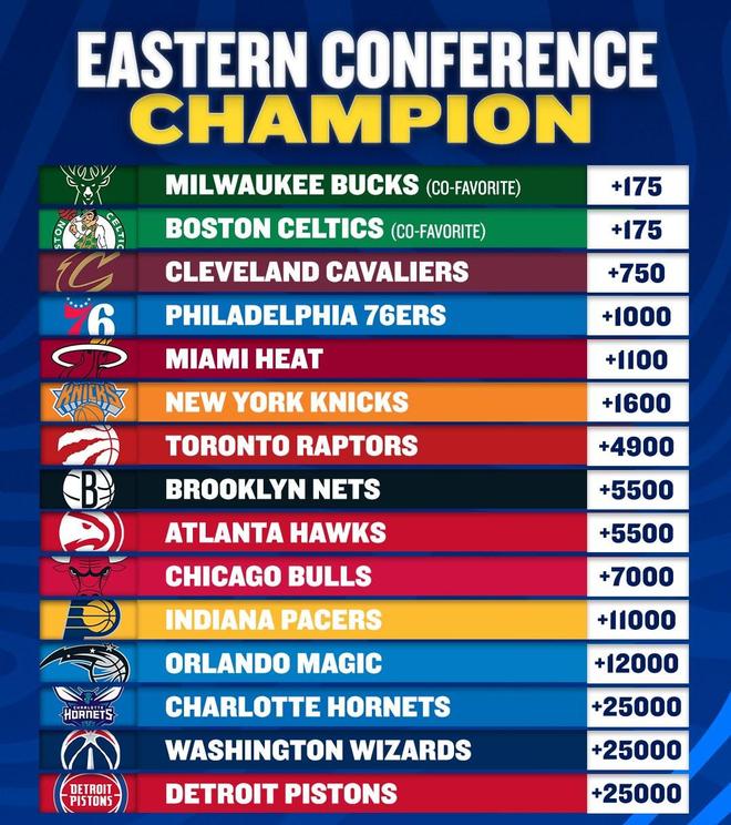 1.凯尔特人和雄鹿(+380),3.掘金和太阳(+550),5.湖人(+1300),6.勇士(+1400),7.骑士和灰熊(+2400)、9.独行侠(+2500),10.快船和76人(+2800),12.热火(+3000),13.鹈鹕(+4200),14.尼克斯(+4200),15.国王(+5000),16.森林狼(+5500),17.雷霆(+7000),18.公牛、猛龙、篮网和老鹰(+13000),22.步行者(+26000),23.开拓者、奇才、黄蜂、爵士、魔术、马刺、火箭和活塞(+50000)。