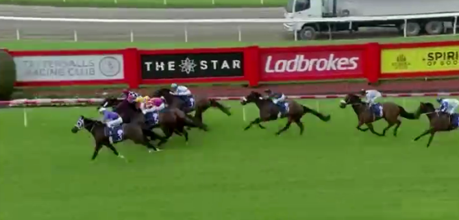 当地时间11月25日下午,总奖金85,000澳币、在澳大利亚墨尔本都本赛马场(Doomben)举行的一场1615米赛事(Tattersall’s Events (Bm85))中,由中国内地著名马主牛福东和陈洪伟等共同拥有的六岁老将“卢梭”(Rousseau,练马师华礼纳Chris Waller、骑师岳礼华Damien Oliver)率先冲线勇夺桂冠!