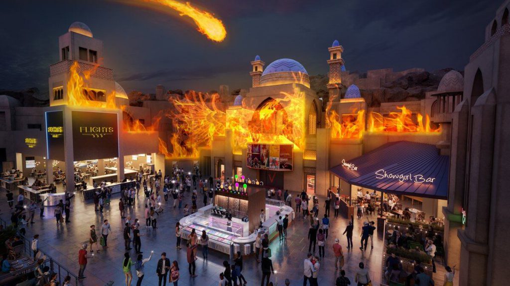 Miracle Mile 官员表示,游客可以在 V 剧院前面和周围的城市景观中观看「火、水、冰、土和风在石头立面上舞动」。