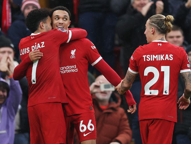 北京时间12月4日凌晨,2023-24赛季英超第14轮,利物浦主场4-3逆转富勒姆,豪取联赛主场7连胜!阿诺德任意球直接破门,威尔逊攻破旧主扳平,麦卡利斯特轰入远射世界波,泰特再度扳平,博比-里德破门反超,远藤航替补远射扳平,1分钟后阿诺德绝杀。