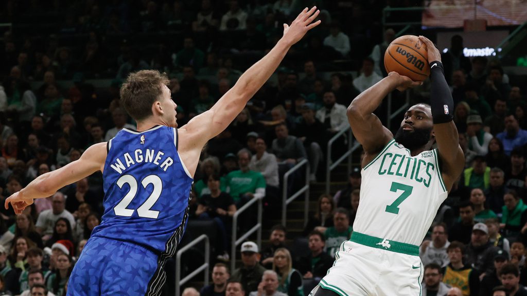 Boston Celtics guard Jaylen Brown (7) shoots over the defense of Orlando Magic forward Franz Wagner (22) during the first half of an NBA basketball game, Sunday, Dec. 17, 2023, in Boston. (AP Photo/Mary Schwalm)