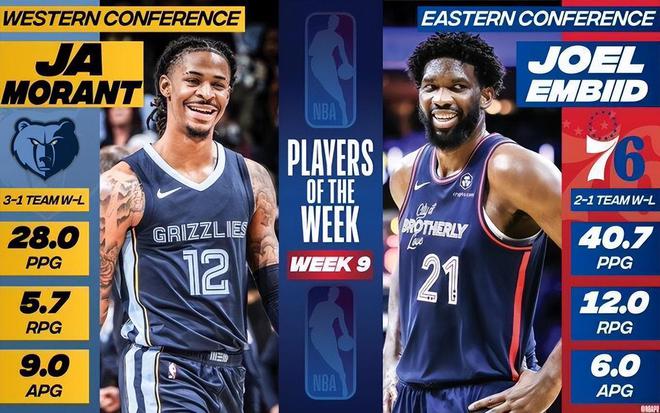 NBA官方公布了第9周的周最佳球员名单。76人的恩比德当选东部周最佳球员,这是他生涯第13次当选周最佳,也是本赛季第2次获此殊荣。灰熊的莫兰特当选西部周最佳球员,这是他生涯第3次当选周最佳,也是本赛季首次获得这一奖项。詹姆斯、库里、字母哥等13位球星获得提名。