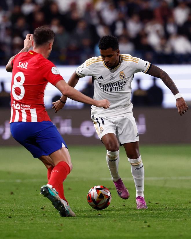 一球在手马竞也踢起了最熟悉的防守反击,考验皇马的攻坚能力。第13分钟,罗德里戈右路单挑萨乌尔,并在禁区内倒地,不过裁判认为是正常的身体对抗,拒绝判罚点球。