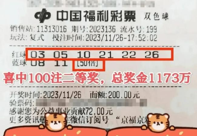 11月26日晚,双色球游戏第2023136期开奖,北京揽获二等奖103注,单注奖金11.73万元。其中,昌平区城北街道百百路美金美超市11313016福彩销售站狂揽二等奖100注,奖金共计1173万余元。记者从北京市福彩中心获悉,当地一彩民50倍投注一张“6+2”小复式票,独中100注二等奖,因为一个号码之差错过3亿元大奖。