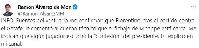 该记者表示,来自更衣室的消息源证实,在对阵赫塔费的赛后,皇马主席弗洛伦蒂诺告诉教练组,姆巴佩的签约已经接近完成。有人告诉该记者,有球员听到弗洛伦蒂诺“承认”了此事。