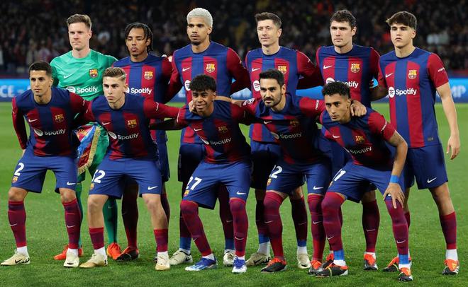巴萨首发:1-特尔施特根、2-坎塞洛、4-阿劳霍、23-孔德、33-库巴西、15-克里斯滕森、22-京多安、32-费尔明、11-拉菲尼亚、27-亚马尔、9-莱万