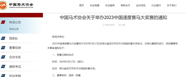中马协在其官网发布《中国马术协会关于举办2023中国速度赛马大奖赛的通知》。通知称,2023中国速度赛马大奖赛将于2024年3月17日在湖北省武汉市东方马城国际赛马场举行。