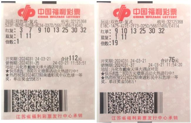 当期来自江苏泰州的一家彩站曝出40注2等的大奖,系1张1倍投的“8+2”和1张19倍投的“7+2”复式票。据了解,这两张复式票的中奖得主周先生是一位70后老彩民,购买双色球已经成为他的习惯了,通常选择复式的方式购彩。这次的中奖票购买于兴化市戴南天泽大酒店对面的第32125368号投注站,买了两张双色球复式票,喜中二等奖40注,四等奖24注,五等奖30注,共收获奖金245100元,根据当期头奖500万元来计算,周先生因一号之差与2亿巨奖擦肩而过。