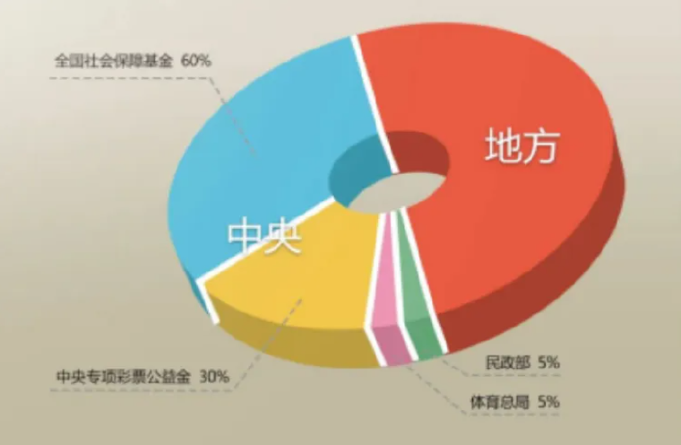 根据国务院批准的彩票公益金分配政策,彩票公益金在中央和地方之间按各50%的比例分配,专项用于社会福利、体育等社会公益事业。中央集中彩票公益金在全国社会保障基金、中央专项彩票公益金、民政部和体育总局之间分别按60%、30%、5%和5%的比例分配。在中央集中的彩票公益金中,用于补充全国社会保障基金的彩票公益金占60%,是最重要的使用途径。