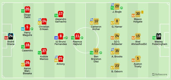 曼联(4231):24-奥纳纳;29-万比萨卡,18-卡塞米罗,5-马奎尔,20-达洛特;14-埃里克森(64’39-麦克托米奈),37-梅努(92’4-阿姆拉巴特);21-安东尼(55’16-迪亚洛),8-B费,17-加纳乔;11-霍伊伦(92’84-惠特利)