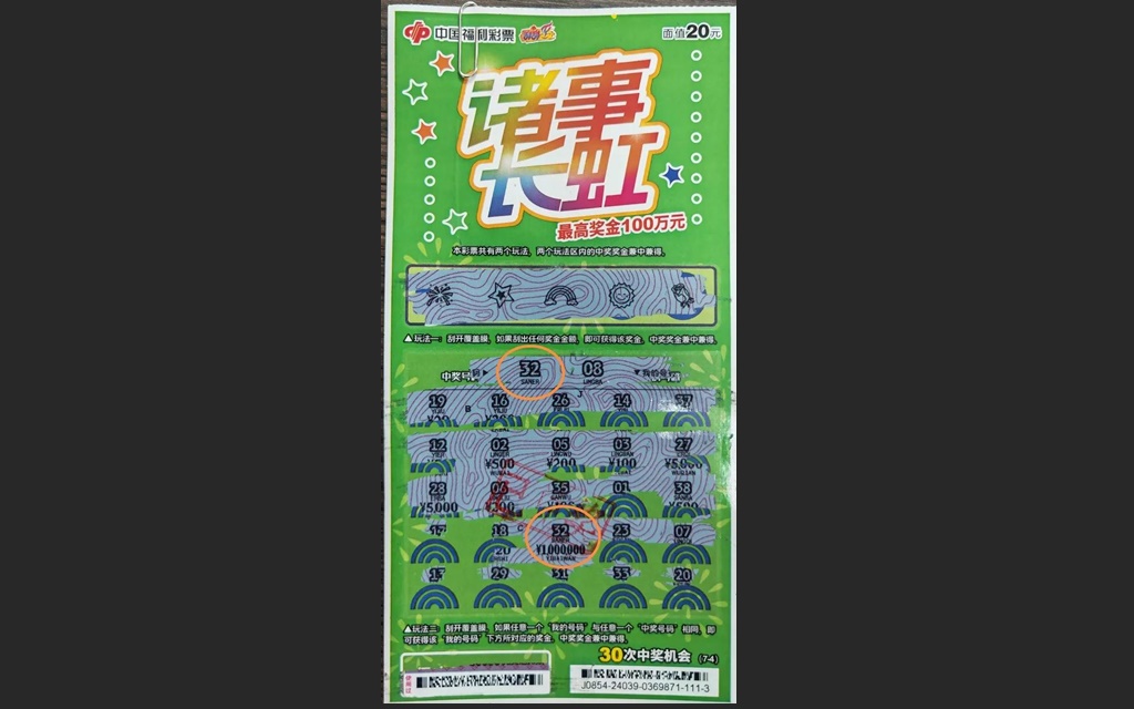 兑奖时,刘先生说道:“我是一名厨师,闲暇之余经常去福彩站购买即开票,那天我来到福彩站,看见柜子里色彩缤纷的“诸事长虹”刮刮乐即开票,便随意挑选了几张开刮,刮到第六张的时候,当刮出‘¥1,000,000’时我惊叫起来,数着票面有多少个“0”,当时激动得说不出话,最后在销售员的确认下,才确信刮中了百万大奖。”