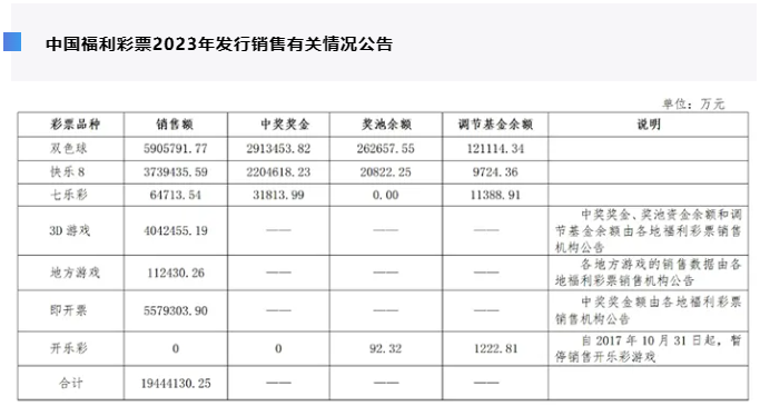以下为《2023年中国体育彩票发行销售数据公告》及《中国福利彩票2023年发行销售有关情况公告》具体情况: