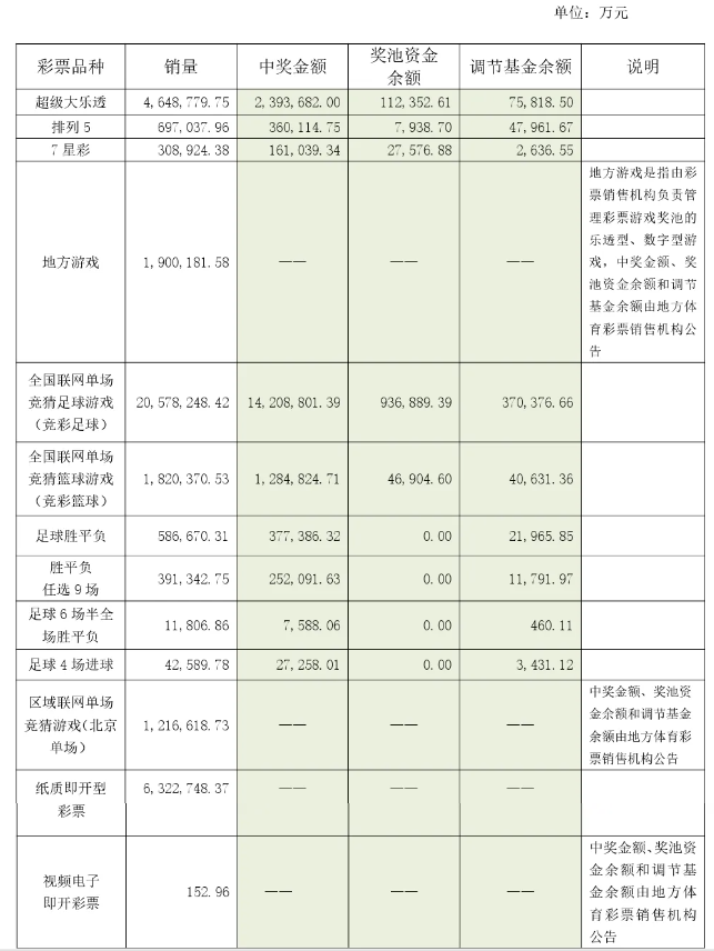 5月29日,国家体育总局体育彩票管理中心发布《2023年中国体育彩票发行销售数据公告》。此前,中国福利彩票发行管理中心也发布了《中国福利彩票2023年发行销售有关情况公告》。该两项公告公布了“中国体育彩票及中国福利彩票所有游戏玩法在2023年的销量、中奖金额、奖池资金余额、调节基金余额等相关情况”。