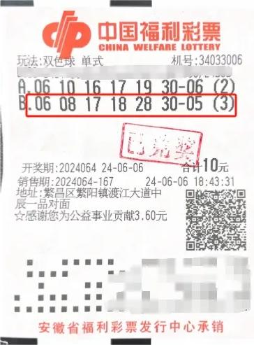 6月6日晚,福彩双色球第2024064期开奖。当期全国井喷21注一等奖,单注奖金562万多元。我省芜湖彩民好运爆棚,凭借一张10元单式倍投号码票,中得其中3注。