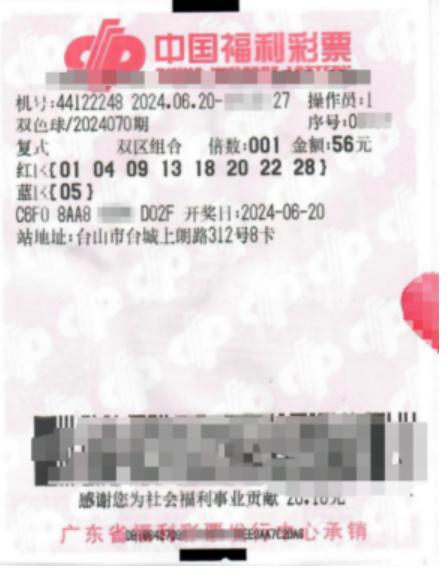 6月20日,中国福利彩票“双色球”游戏第2024070期开奖,当期全国中出一等奖8注,其中1注花落江门台山市台城上朗路44122248福彩销售站点。中奖彩票是一张56元的自选1倍“8+1”复式投注彩票,该复式票共中得一等奖1注、三等奖12注、四等奖15注,总奖金为7,550,573元,该大奖是今年江门市中出第一个五百万元以上大奖。