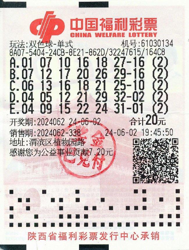就在6月2日19点45分,渭滨区植物园路61030134号投注站打出了一张5注单式2倍机选票,其中第一注号码命中一等奖,中得总奖金1912.96万元。