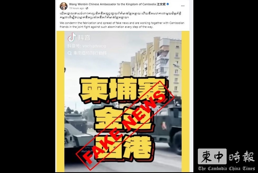 艾玛丽指出,随着一部分外国的过激反对组织对“柬老越发展三角区”(CLV)的合作进行造谣,并以此来煽风点火和拉拢柬埔寨国内群众参与暴力示威推翻合法政府的同时,8月19日,有一个中文视频在中国抖音平台散播假新闻,称前国防部长、现任国王高级顾问狄班和现任国防部长狄西哈领导军队发动了政变推翻政府,并冲进总理府抓捕洪玛耐总理,以及进入私邸抓捕参议院主席洪森。