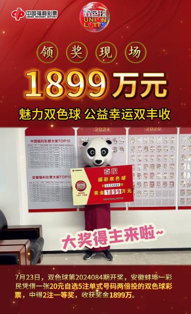 7月23日晚,安徽省蚌埠一彩民凭借一张20元自选5注单式号码两倍投的双色球彩票中得2注一等奖,收获奖金1899万余元,真可谓是好运爆棚!