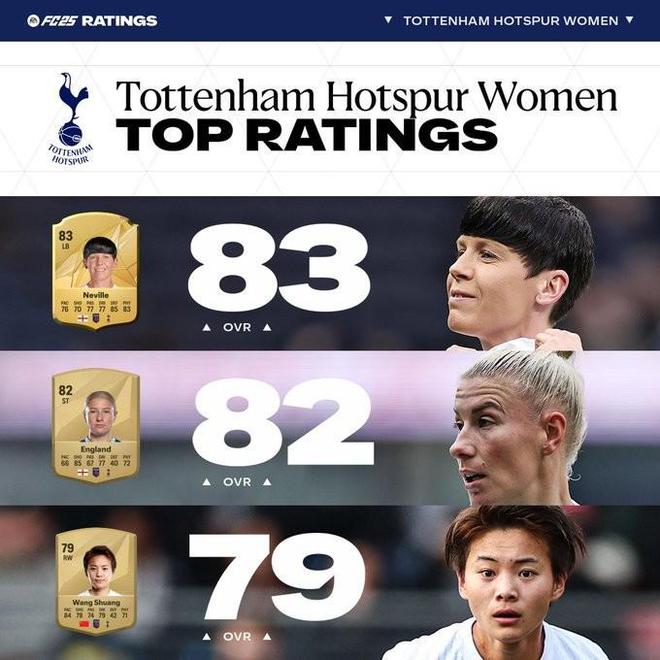 托特纳姆热刺官方公布了他们球队女足FC25能力值排名前11位的球员,王霜以79的评分排名队内第三。