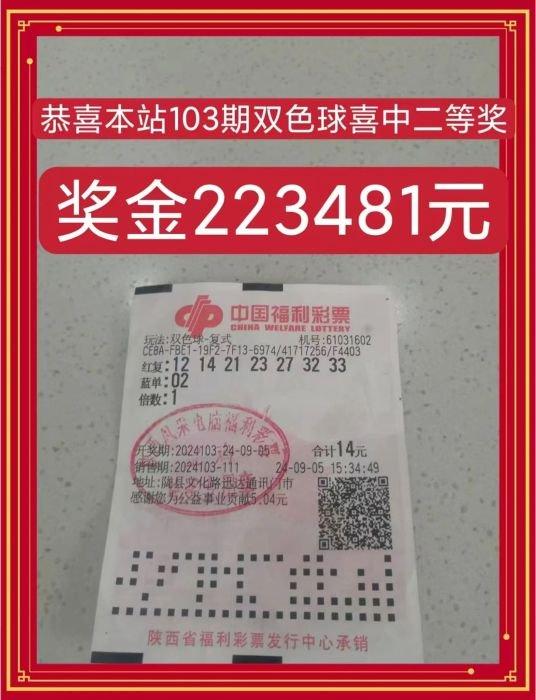 牛先生是双色球第2024103期二等奖得主。9月5日15点34分,他在陇县文化路迅达通讯门市福彩第61031602号投注站打出的7+1复式票,幸运中得了双色球二等奖1注、四等奖6注,收获总奖金224681元。