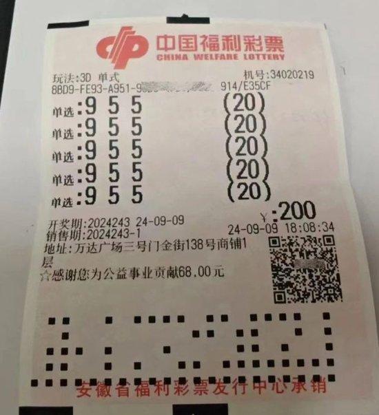 9月9日晚,福彩3D游戏第2024243期开奖,蚌埠万达广场三号门旁的34020219号福彩销售网点传来喜讯,该站售出的一张3D单式票中出100注单选奖,奖金104000元。