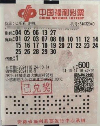 10月14日,七乐彩第2024118期开奖,安徽彩友揽获全国唯一一注七乐彩一等奖,奖金189万元。