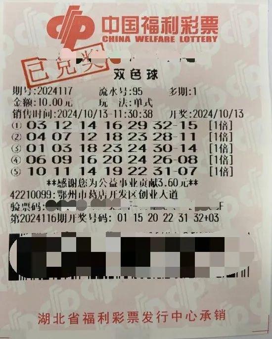 10月13日晚,福彩双色球第2024117期开奖。湖北省鄂州市中得一注二等奖,奖金20万元。