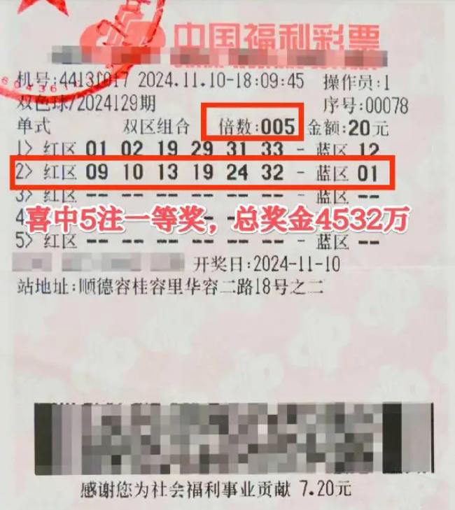 这张4532万元大奖彩票显示这是一张2注号码、各5倍投、20元投入的单式票,投注时间为11月10日晚18点09分45秒,流水号78。其中第2注号码与当期双色球开奖号码完美匹配,一举中得5注一等奖。同时这张票也符合派奖条件,另外中得5注一等奖特别奖,两者相加单票总奖金高达4532.4805万元。