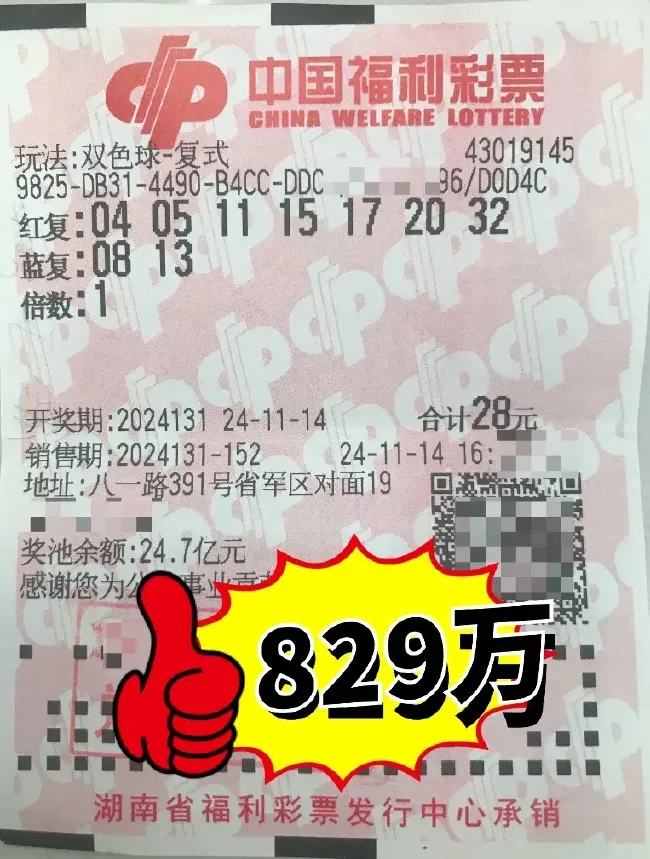 11月14日晚,中国福利彩票双色球游戏第2024131期开奖,本期开出红球号码为32、04、11、05、20、15;蓝球号码为13。全国中出一等奖15注,单注奖金647万元,其中15注一等奖中有11注满足双色球12亿派奖要求,因此额外收获了一等奖特别奖,奖金181万元。惊喜的是,长沙市八一路391号省军区对面43019145福潮店一位幸运彩民摘获其中1注一等奖和1注一等奖特别奖。