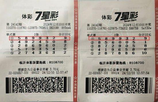 2024年12月10日,体彩7星彩第24142期开奖,开奖号码为“5、8、9、9、3、2 +9”,全国中出一等奖2注,单注奖金500万元。本期中出的2注一等奖均出自山东临沂。