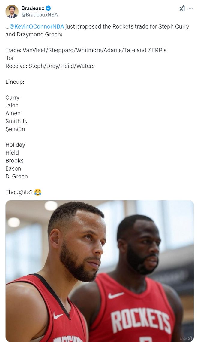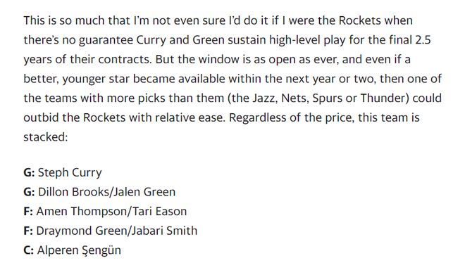 北京时间1月22日,《雅虎体育》记者凯文-奥康纳撰写了一篇长文解析金州勇士队如果要重建的话怎么交易利益是最大化的,他在文中提到了多种的交易方案,包括如何送走库里与追梦两位长约老将,其中最令我印象深刻的是与火箭的交易,毕竟我是铁杆火蜜。