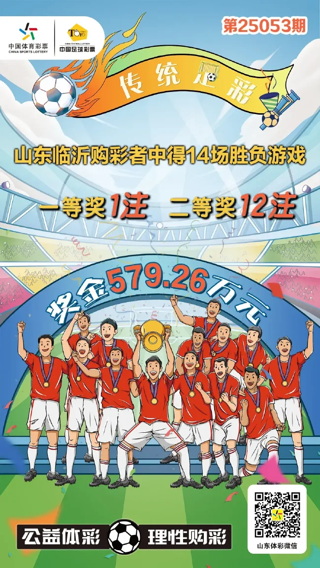 4月7日,传统足彩14场胜负第25053期开奖,当期一等奖全国仅开出3注,单注奖金500万元,临沂一购彩者摘得其中1注一等奖,加上12注二等奖,收获奖金5792612元。