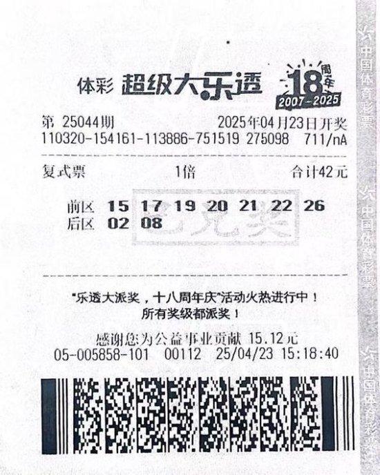 据了解,陈先生可谓是体彩的“忠粉”,多年的购彩经历中只投注体彩玩法,曾中过11万多元体彩排列3,但在此之前还未中过百万大奖。2025年大乐透8.8亿大派奖启动之后,陈先生非常关注,他特意将大乐透投注改为复式票,用他的话说“这样正好就能参加派奖了”。4月23日,大乐透第25044期开奖,陈先生在当天下午在苏州3205005858体彩网点购买了一张“7+2”复式票,购彩额为42元,这样就越过了“18元”的派奖门槛。当晚该期大乐透开奖,开奖号码为“15、17、21、22、26+02、08”。陈先生除了中出1注一等奖,同时还中出10注四等奖、10注六等奖,连同派奖奖金,最后总奖金达到12131333元。