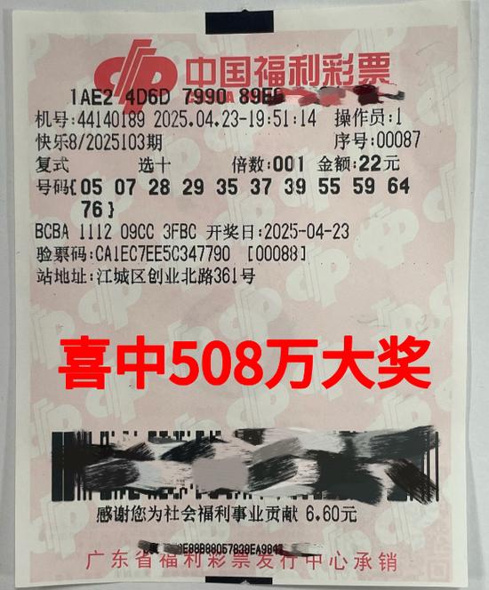 4月23日,中国福利彩票快乐8第2025103期开奖,当期全国共中出“选十中十”一等奖1注,花落阳江市江城区创业北路361号44140189福彩销售站点。中奖彩票是一张22元的“选十玩法”11个号码自选复式票,中得1注“选十中十”和10注“选十中九”,总奖金高达508万元。这是今年阳江市中出的第一个500万元以上大奖。