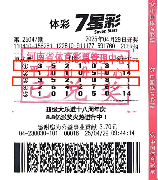 4月29日,7星彩第25047期开出号码“3、5、2、1、0、3+12”,平顶山市鲁山县4104230030体彩实体店购彩者李先生(化名),中得2注二等奖,奖金12万余元!
