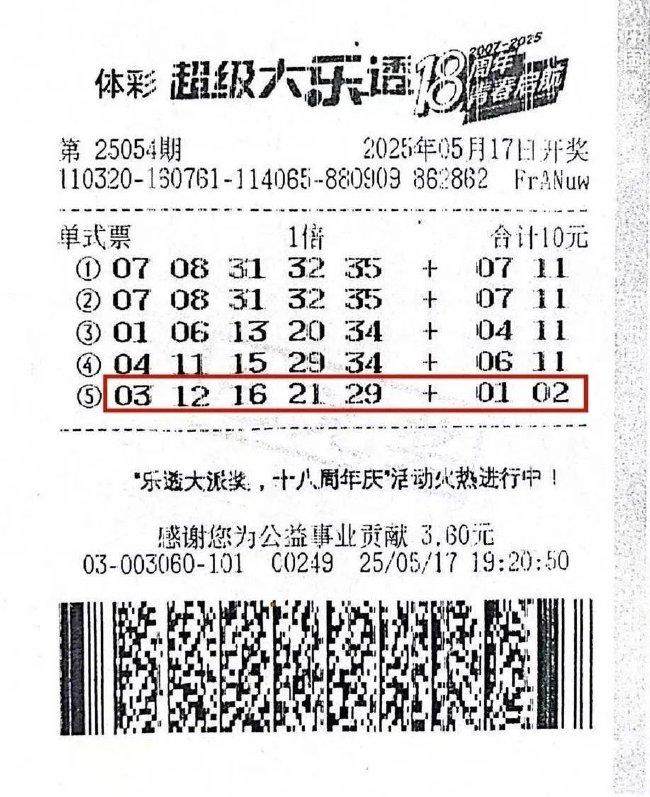 据了解,王老伯早已退休在家,但他很早就开始买彩票,特别喜欢体彩的大乐透,之前也没有中过大奖。5月17日这天正是大乐透第25054期的开奖日,王老伯晚饭后想想还没有买大乐透,就来到了徐州3203003060体彩网点,先打了两注一模一样的大乐透自编号,后面三注号码选择机选。