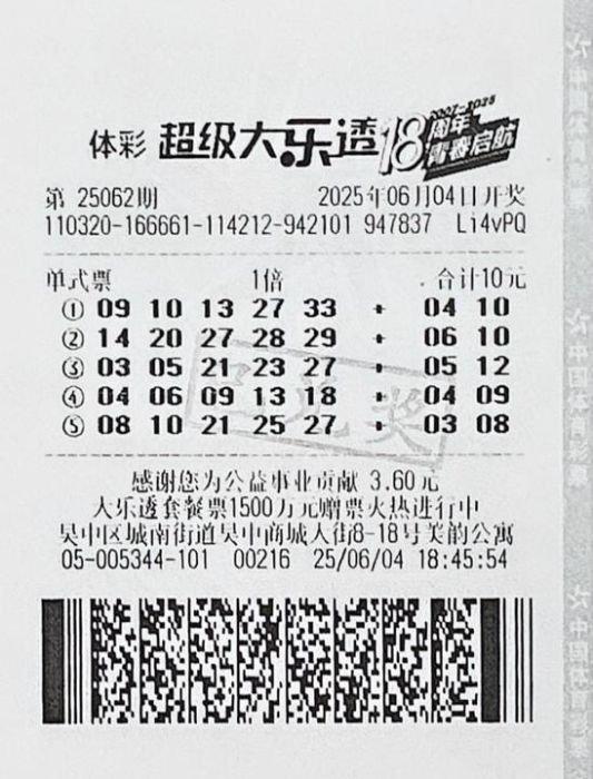在大乐透套餐票1500万大赠票活动的助力下,江苏彩友近期接连中得大乐透头奖,而中奖方式也不尽相同,套餐票、复式票、单式票均有大奖中出。苏州彩友高先生在6月4日开奖的大乐透第25062期,凭借机选号码中得1注1000万大奖。